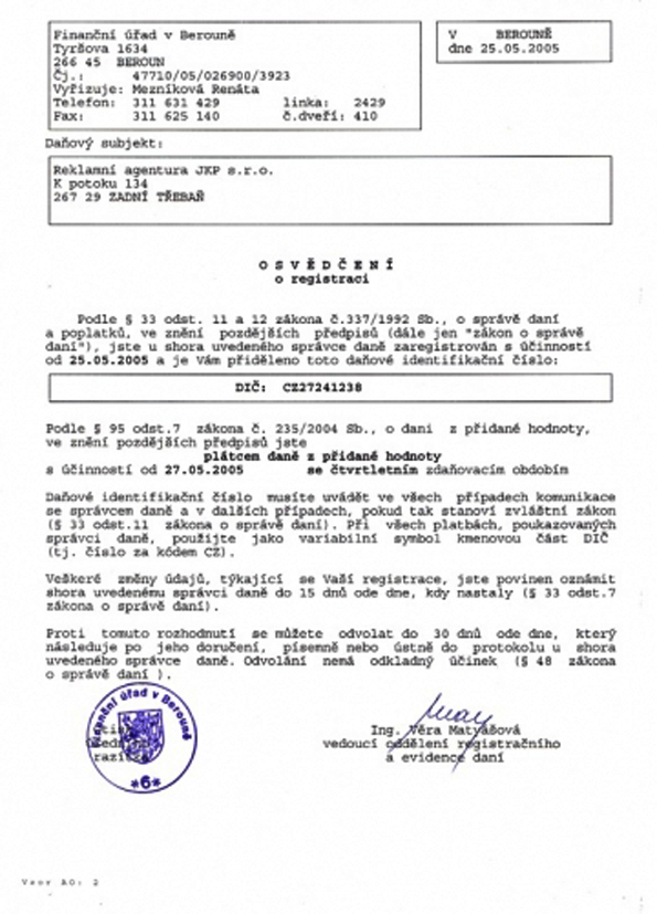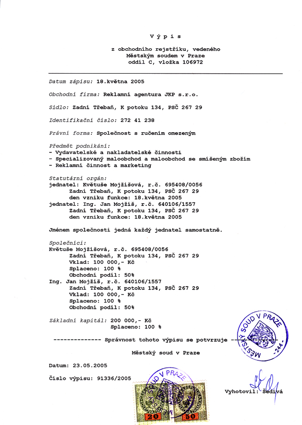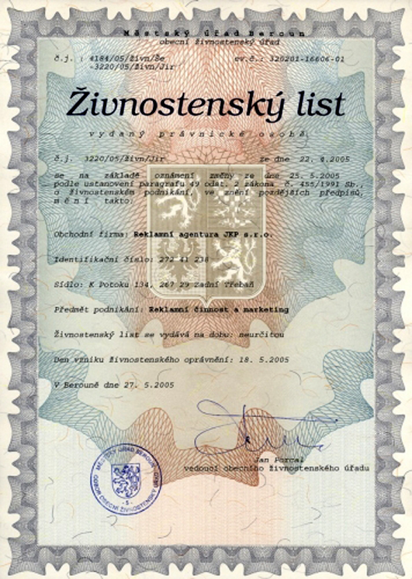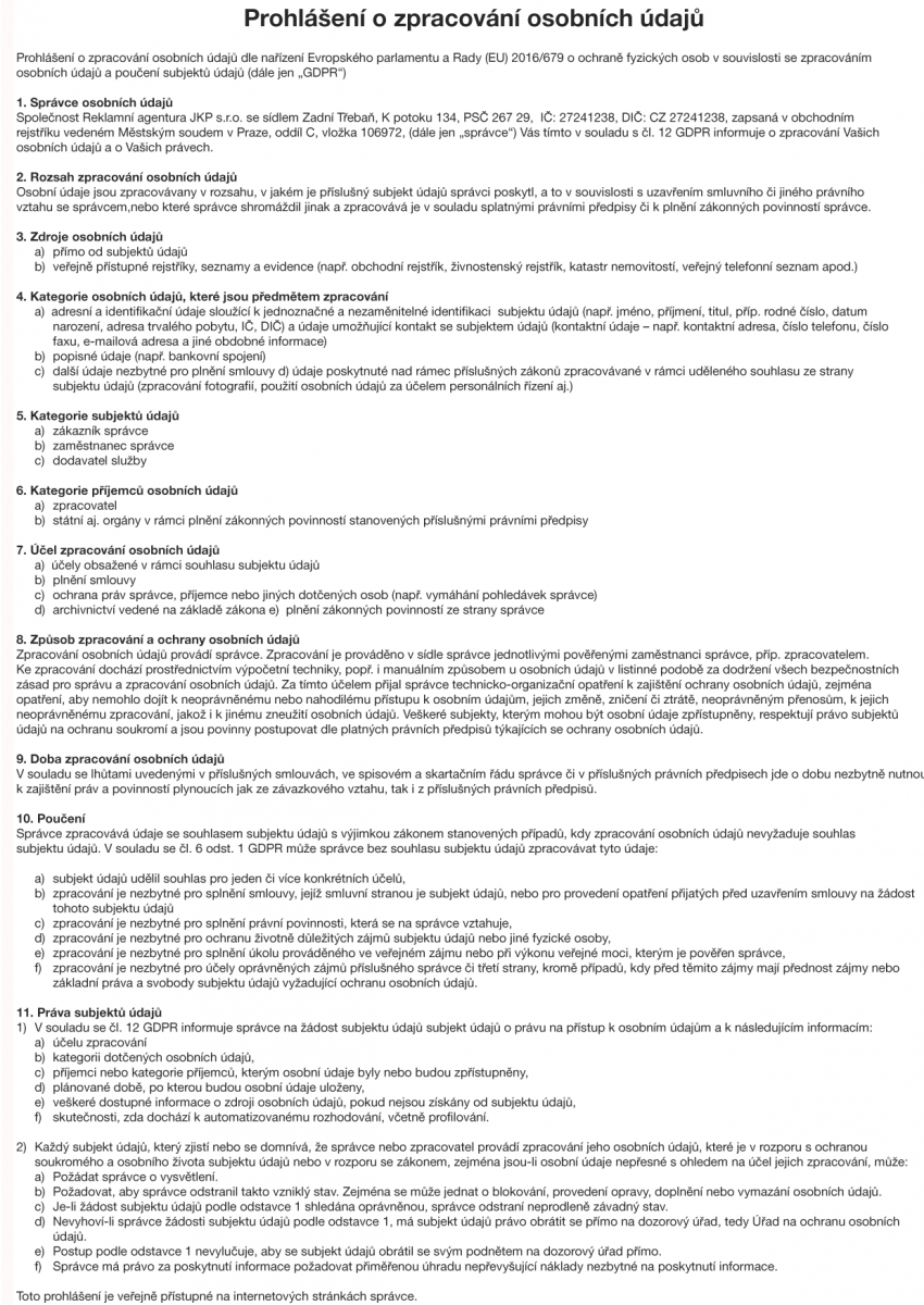 Reklamní agentura JKP s.r.o. K Potoku 134 267 29 Zadní Třebaň |